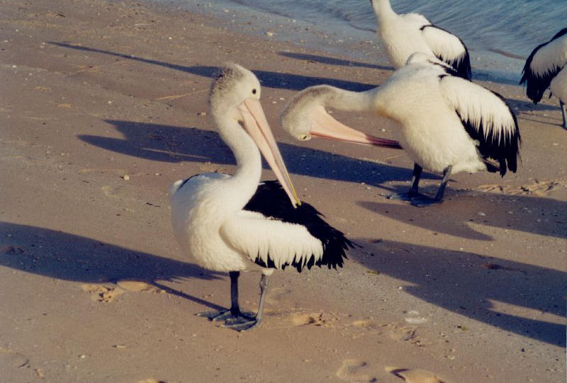 Nach dem Frühstück raus an den Strand, Pelikane lassen sich beim Putzen des
