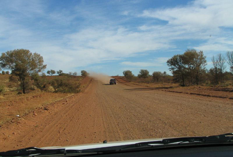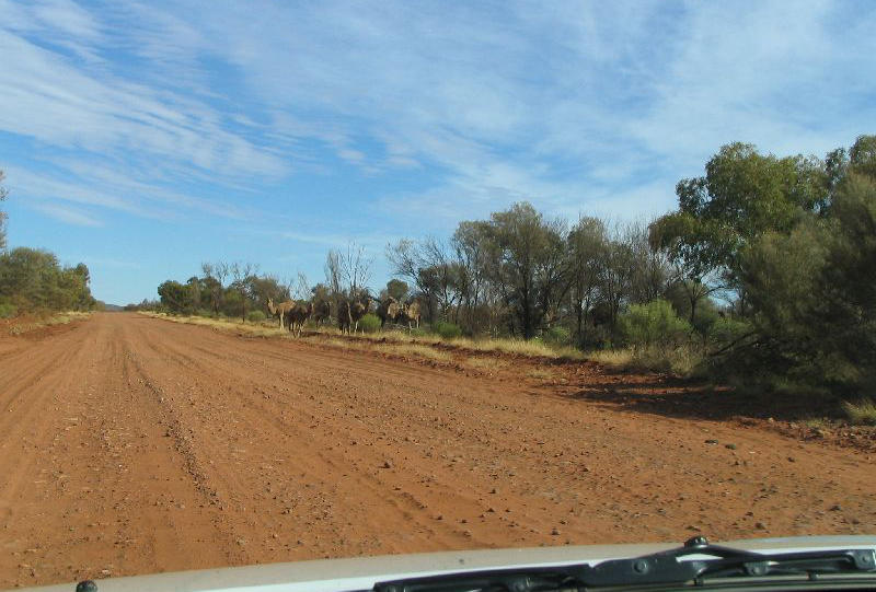 Wir fahren eine ungeteerte Strecke bis zum Kings Canyon. Im Allgemeinen gut zu fahren, aber stellenweise sehr rau. Und dadurch hohe körperliche Belastung und hoher Lärmpegel. Zwischendurch, mit Blick auf den Kings Canyon gegessen. Und dann weiter, auf der gesamten Strecke sind uns etwa 8 Fahrzeuge begegnet.Nach der Ankunft waren wir dann auch gleich auf dem knapp einstündigen Kings Creek Walk, aber leider waren da sehr viele Fliegen und auch Menschen!Hier kostet der l bleifrei 1,75 AU$!Wir haben unterwegs neben der Piste freilaufende Kamele, Pferde, einen Dingo und eine Kamelherde gesehen.Alle Tiere scheinen aufgrund ihrer Hinterlassenschaften in Form von Kothaufen auch gern die Straßenseite zu wechseln… Aber wir hatten Glück und kamen mit Staunen und Hupen durch.