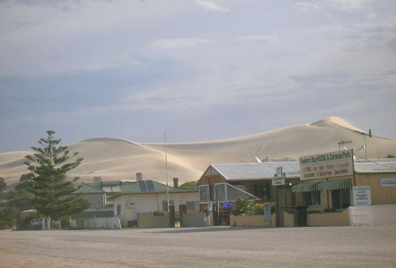 Der Wecker klingelt um 6 Uhr, weil wir möglichst viele Kilometer vor der Hitze fahren wollen. Nachts gab es ein Gewitter und Regen sagt A.Den „Känguru-Selbstmord-Highway“ gefahren (so viele Kadaver und immer nur tote Kängurus) und nach Border Village (SA) gab es mehrere ausgewiesene Lookouts auf die Steilküste. Unterwegs trafen wir ein Radfahrer Team, das 16.000 km rund um Australien radeln wollte. Und eine Gruppe, deren Mustangs mit Planen vor Steinschlag und Staub geschützt waren. Für mich am Roadhouse ein T-Shirt gekauft und dann weiter bis Fowlers Bay und dort für 23 AU$ einen Platz für die Nacht ergattert. Wasser und Strom sind streng limitiert! Hier sind bis auf die riesigen Sanddünen keine schönen Eindrücke zu erleben; alles sieht eher schäbig, vergessen und schlecht in Schuss gehalten aus. Der Strand ist voller Seetang, Häuser und Bänke defekt. Der Ort hatte sicher schon bessere Zeiten, schade um dieses herrliche Fleckchen Erde.